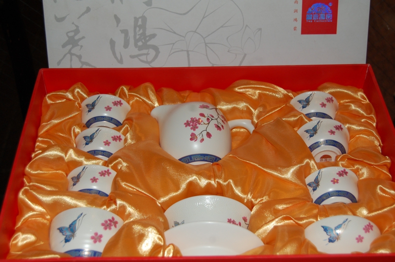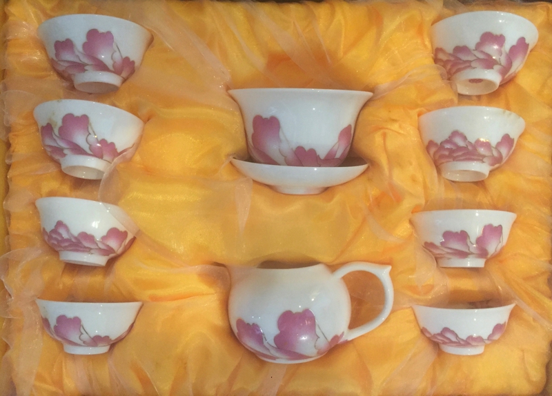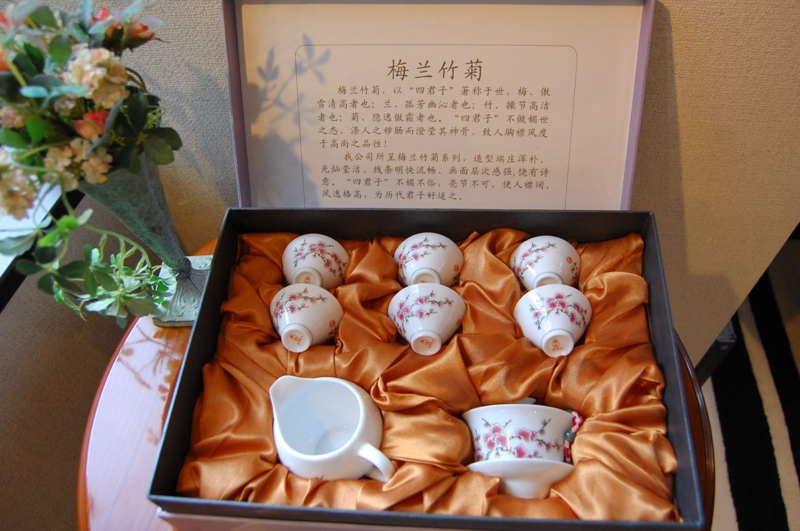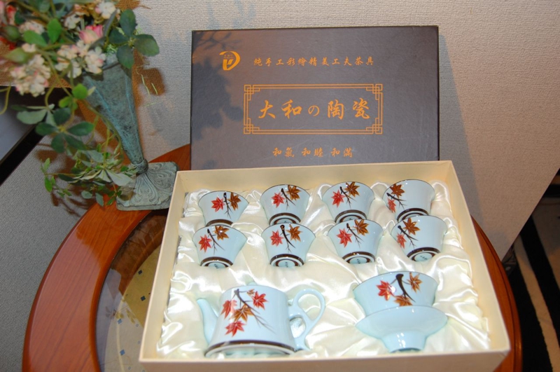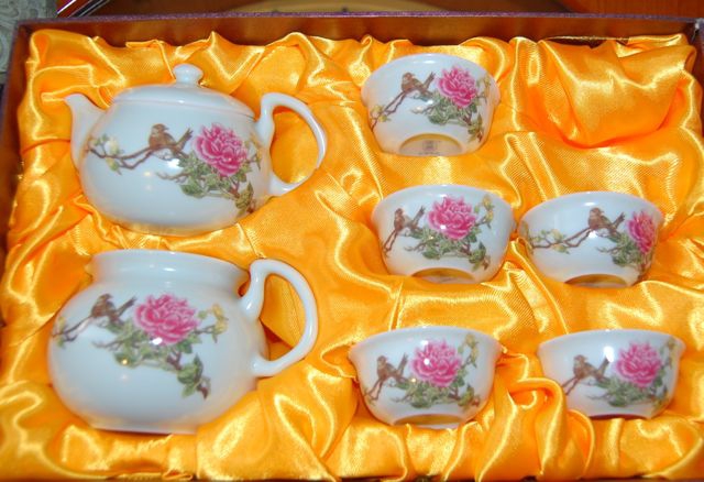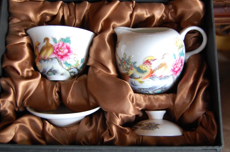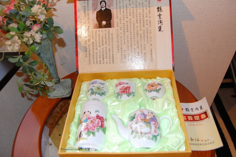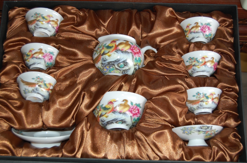桃、梅、牡丹、鳥、龍、中国古来からの吉祥柄で描かれた華やかな「茶器セット」は